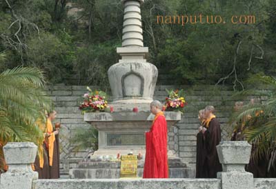 祭扫仪礼上,舍利塔前供列鲜花、水果等,简单而庄重。法师们衣著齐整,心存敬重,虔敬地诵经。庄严浑厚的梵呗声缭绕上空,青山无语,万物同悲,缅怀之情尽在不言中。