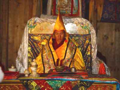 琼果杰寺第六世活佛强巴云旦首先向主供佛和护法神敬献了哈达,在法号及祝贺经声中,琼果杰寺第六世活佛正式坐床继位。