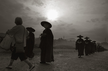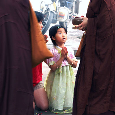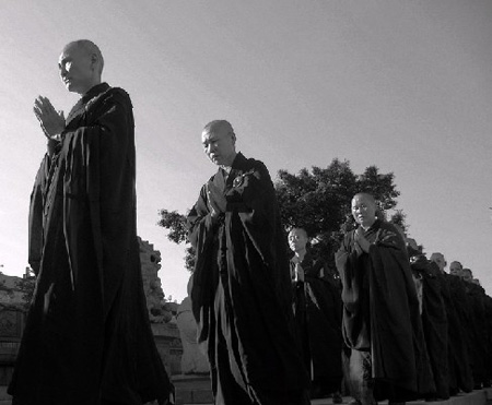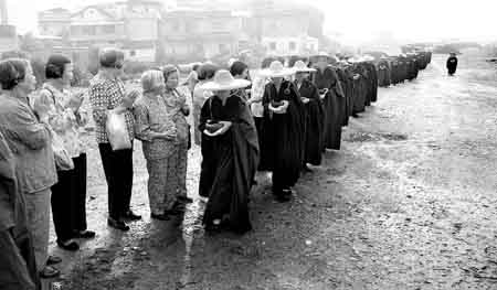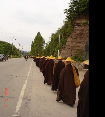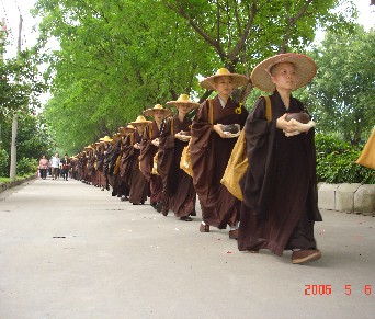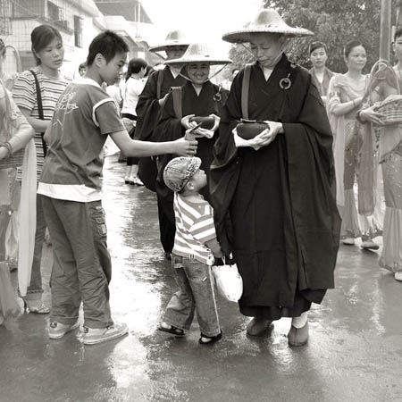 2006年5月6日,千佛塔寺160多位僧人,著衣持钵、仪表庄严,从寺院出发第四次托钵行脚,前往梅江区鹤山大觉寺,行进途中,信众沿途争先供养。