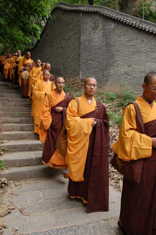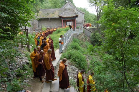 上午9:00,一个无比清凉的日子,微风拂面,一抹往日的骄阳烤灼;今日的终南山显得格外清新瞩目,四面八方赶来的贤圣僧近千人,云集此地。每位应供都的脸上都洋溢着无语言表的笑容与憨厚及纯真,和蔼可亲的法师们肃穆以待。当钟鼓齐鸣召集大家参加法事的时候,只见整装待发的僧人们威仪赫赫,庄严肃穆的随同大众师分成两序,缓缓序序的走进大雄宝殿;当大殿排满时,大家又不约而同的站满了殿外的小广场,这时,可以说是人山人海;随着维那师的磬槌声起腔声,乐众师的鼓鱼铙钹的合奏声,大殿四周环绕起了缭缭而又婉转动听的梵乐声……。