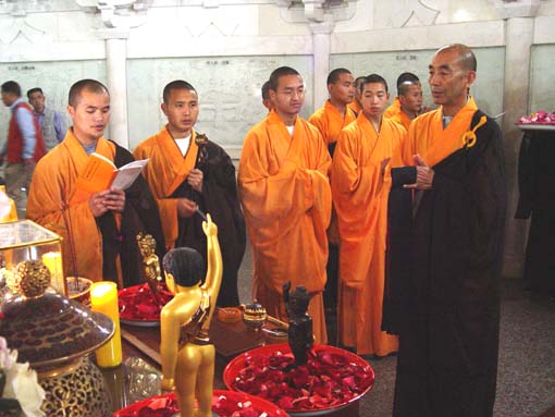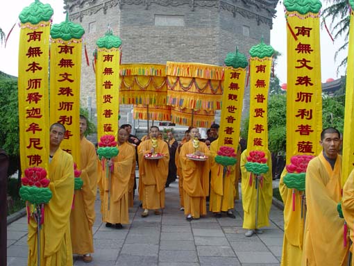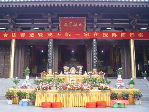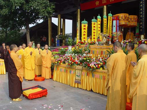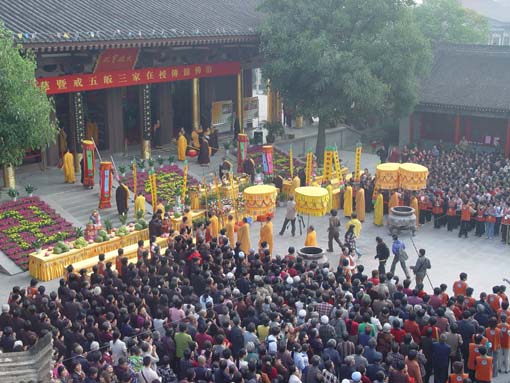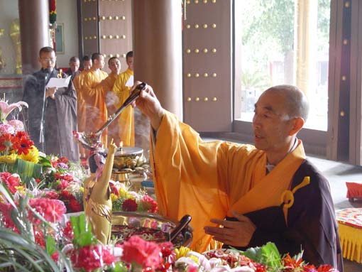 七点整四众弟子已在大雄宝殿前整齐列队,高唱释迦牟尼佛圣号。释迦牟尼太子在香花、幢幡、宝盖及钟鼓齐鸣、梵贝清悠的氛围中,从宝塔地宫恭迎至大雄宝殿。在恭迎的过程中,天空突现瑞象,太阳放射出彩色光环,朵朵祥云飘浮在大雄宝殿上空,使此次殊胜的法会更加庄严。释迦牟尼太子恭迎到大雄宝殿后,众弟子们在佛前忏悔发愿,同赞佛陀功德。在“我今灌沐诸如来,净智庄严功德聚,五浊众生离尘垢,同证如来净法身”的念诵声中,开始用香汤功德水为释迦牟尼太子沐浴。