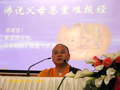 讲座于今天上午9时,开始在南普陀寺讲堂举行,以"感谢您!敬爱的父母,是您们给了我整个世界"为主题的皈依共修法会三天。法会恭请闽南佛学院教务主任静安法师主讲。法师依《佛说父母恩重难报经》来探讨佛教的孝亲观,着重就经中所言的母亲十月怀胎、亲恩、子过、报恩等一系列问题,来阐述父母对子女的恩德,及作为子女应该如何报答父母的深恩。