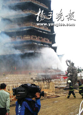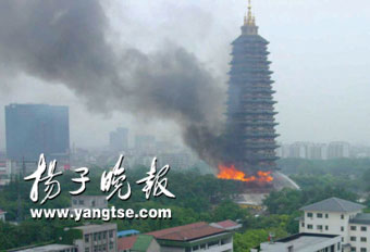 消防队员紧急救火。 被大火围困在宝塔阳台的工人,焦急地等待救援。 被烈焰和浓烟包围的宝塔。小伟肖蔚 摄 扬子晚报报道: 有“神州第一佛塔”之称的常州天宁宝塔,在即将全面竣工前不幸“惹火上身”。昨天中午,因现场施工工人违规操作电焊突发大火,导致正在塔内装潢施工的21位工人被困,经常州消防部门多方紧急介入,被成功解救,而熊熊大火在燃烧了两个多小时后终被扑灭。 宝塔发“火”21名工人被困 昨日中午11点15分左右,有人突然发现天宁宝塔一楼飞檐上冒出滚滚浓烟,不一会儿,整层就被火光和浓烟吞噬。在现场和塔内进行工程最后装潢的数十名工人顿时炸开了锅,在塔下施工作业的民工一边惊慌失措地逃离现场,一边拨打报警电话,而在塔内施工的部分民工退路被大火截断,无奈向塔的高层“撤退”。 记者得到线索后立即赶到现场,只见耸立在千年古刹天宁寺北侧的天宁宝塔整个塔身几乎被浓烟包围,透过窗户,能隐约看到里边的火光,还能听到噼里啪啦的声音。在宝塔的5楼观景台上,一排民工正朝远方挥手“呼救”。当时,塔内被困民工有21人,情况十分危急。 33辆消防车高塔扑救 常州市消防支队在11:19接到火警后,紧急调动33辆消防车和180余名官兵,火速投入营救。在现场,记者看到,消防车如长龙一般依次停放在天宁宝塔附近,消防官兵正用水枪和架设在消防车上的车载炮(一种射程高达40余米的高压水枪)压制宝塔内肆虐的火苗。然而,由于宝塔正在施工修筑中,塔下广场上堆放的建材和挖掘的沟壑仅能容纳两辆消防车进入,加之当日刮西南风,起火点在塔内的东北方,消防车喷出的水龙被大风一吹,水势减弱不少,给扑救工作带来了极大的难度。 火灾发生后,常州市市长王伟成等即赶赴现场,指挥扑救。当时为营救塔内被困的20多位民工兄弟,11点40分,10余名消防官兵在支队陶国忠副支队长等带领下,兵分两路,携带呼吸机和水龙管,冒着不断砸落的木棍和铜皮,边扑灭楼道上的大火,边向塔顶挺进。由于楼梯间内弥漫烟雾,钢质楼梯被火焰烧得发红,两支救援队伍历经艰难,半小时后才找到被困在四楼的民工。随着民工被成功解救,大火也在当日下午1点37分被顺利扑灭。 乾隆手书拓成金匾付之一炬 “火灾发生时,大火很快从一楼烧到七楼,令人心痛不已。”天宁寺一位工作人员告诉记者,起火时,几名民工正在宝塔一楼焊接钢架,紧靠在电焊现场还有几名民工正在调制油漆,电焊火花引燃了油漆,几名民工手忙脚乱地寻找灭火器,等他们找到灭火器时,火借风势引燃了刚刚刷上油漆的木制楼梯,一只小小的灭火器已经无法控制大火的蔓延。 据了解,始建于2002年的常州市天宁宝塔总建筑面积约2.7万平方米,共有13层,高153.79米,宝塔采用唐宋楼阁式结构,八角形布局,是全国最高、最大的佛塔。由于全钢架结构,总用钢量4600多吨,也是我国“第一佛教钢塔”。建设之初,常州市政府将此视为一项千年工程,按7度抗震设计,质量要求特别高,而这次突发大火,始料未及。 昨天,常州相关部门独家向本报记者披露了火灾的情况,据介绍,经过调查组现场勘察,在起火地点发现大量氧气瓶和焊接用具,初步认定起火原因为工人不当焊接引起。这次大火烧毁了一层“金身”飞檐,塔内东侧楼梯二至三层被毁,此外,三层以下木质结构部分损毁严重,更让人扼腕的是,一块由乾隆手书拓成的金匾也被付之一炬,所幸宝塔整体结构安然无恙。目前,直接财产损失仍在调查。昨晚,有关方面表示,今天,常州各相关部门和专家将对宝塔受损情况进行科学检测,尽快拿出修缮方案。小伟时双庆肖蔚 新闻链接天宁寺塔堪称常州地标 位于天宁禅寺中轴线北端、高153.79米的13层天宁宝塔,整座佛塔的构成以唐风为主。由莲花座承托,塔身外饰5万块镌佛玉石,塔面铺青铜铭文瓦,塔内每层置佛匾,飞檐翅角悬挂风铃,汉白玉石壁装饰内墙。塔刹采用金刚宝座形式,一主四次五根刹杆并立,内钢外金,灯饰展示五彩华光。围绕在大塔四周的塔林由2000多尊汉白玉小宝塔和镌刻经文的汉白玉护栏组成。天宁宝塔内供奉有镇塔之宝——天然水晶佛。这是用全世界最大的整块水晶手工雕刻而成,与东方灵山大佛、西方乐山大佛、南方香港大佛、北方云岗大佛互为脉络,联袂结缘。