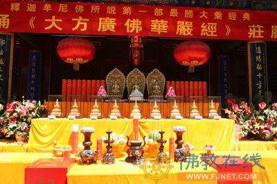 佛教在线5月10日讯 2006年5月10日,北京广化寺隆重举行《大方广佛华严经》法会,在严净的道场中,北京市佛教协会副会长、北京广化寺住持怡学法师进行主法,菲律宾法海法师为法会唱颂华严赞,法会在庄严肃穆的气氛中进行,四众弟子数百人以念诵《大方广佛华严经》或随喜等方式参加了法会,吉祥法喜充满。法会期间,中国藏语系高级佛学院副院长李印来先生、中国慈善总会荣誉会长、中国佛教协会顾问李玉玲女士等参访了北京广化寺。