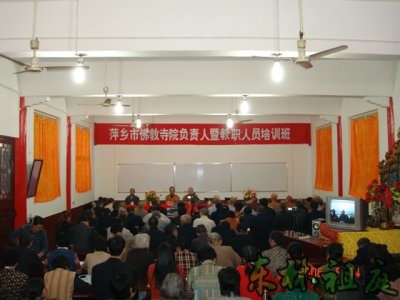 东林寺报道:应萍乡市佛教协会的诚挚邀请,2006年5月14日,大安法师一行前往萍乡宝积寺弘法,在萍乡市佛教寺院负责人暨教职人员培训班上,大安法师为四众弟子作了时间为二个小时,主题为“教内信仰状况”的开示。开示结束后,大安法师还现场回答了四众弟子的提问。萍乡市各寺院负责人认真聆听法师的开示,积极提问,现场四众弟子法喜充满,最后大家以热烈掌声感谢大安法师到萍乡弘法。