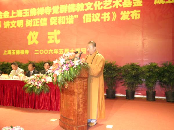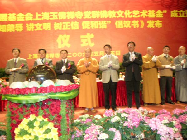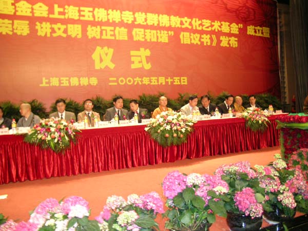 玉佛寺网站报道:2006年5月15日上午,“上海文化发展基金会上海玉佛寺觉群佛教文化艺术基金” 成立仪式在上海玉佛寺觉群楼多功能厅举行。出席成立仪式的领导有“上海玉佛寺觉群佛教文化艺术基金”名誉理事长,上海市民族与宗教事务委员会主任周富长先生、“上海玉佛寺觉群佛教文化艺术基金”理事长觉醒法师、市文明办主任朱匡宇先生、上海文化发展基金会办公室主任沈根林先生以及相关领导和各方代表共约400人。“上海玉佛寺觉群佛教文化艺术基金”名誉理事长以及市民宗委主任周富长先生共同为基金揭牌。“上海玉佛寺觉群佛教文化艺术基金”是经上海文化发展基金会批准设立的的专项基金,隶属于上海文化发展基金会,由上海佛教协会会长、上海玉佛寺方丈觉醒法师担任基金的理事长。基金专门用于玉佛寺推动上海佛教文化艺术事业的发展,促进佛教文化的对外交流,提高广大佛教信众的整体素质,为构建和谐社会服务。