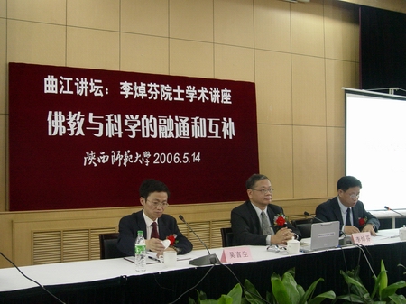 佛教研究网报道:2006年5月14日上午,香港大学副校长、中国工程院院士李焯芬教授在陕西师范大学作了一场题为“佛教与科学的融通和互补”的学术报告,此次报告由陕师大党委副书记、副校长王涛教授主持,陕师大佛教研究所所长吴言生担任讲评人。