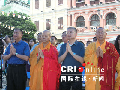 澳门特区行政长官何厚铧、澳门佛教总会会长健钊法师、澳门佛教总会副会长愿炯法师共同主持浴佛法会