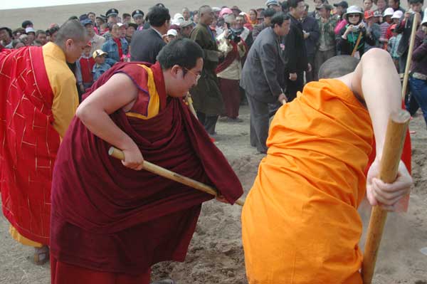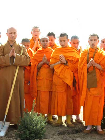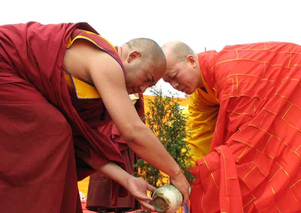 为使北海禅院在未来能更好地构建大西北文化长廊文化交流平台,更好地促进民族团结、家国和平、社会和谐,明贤法师亲赴陕北黄河壶口瀑布区水,又赴黄帝陵取土,并在本次盛会上混合黄河水和黄帝陵土为北海禅院奠基。明贤大师表示,在这个经济、文化、信息全球融合的时代,交流与和谐是时代的主题,北海禅院坐落青海湖环湖路的终始点上,历代高僧的环湖朝圣均由此出发、至此圆满,北海禅院不仅要弘扬佛法、慈济世人,更旨在融通三大语系世界各国佛教、增进民族团结,并以实际行动参与到构建和谐社会的时代使命之中。