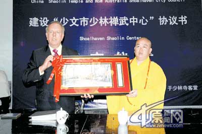 10时30分,少林寺与澳大利亚少文市政府筹建“少林禅武中心”签字仪式正式举行,少林寺客堂内喜气洋洋,先是瑞格-瓦特森市长向少林寺方丈和所有僧人表示了最崇高的敬意,他说,少林文化很早就传到了澳大利亚,优秀的传统少林文化被澳大利亚人民所接受并喜爱,少林文化所倡导的文明、健康的理念和行动更是让澳大利亚人痴迷,少林寺要在自己的家乡建造“新少林寺”的消息传开后,被绝大多数当地人当做一件很荣耀的事去讲述。
