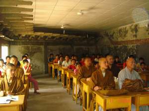 在小园长的陪同下,佛学院师生参观了园区,一个宽敞的农家院落,几处殿堂,梵音缭绕。贴南墙一排简陋的平房,是家园的办公室、宿舍和食堂。走到排房的尽头,拐进月亮门,一间未经装修的宽敞的旧库房,摆上整齐的桌椅,就是就教室。平时孩子们被安排在附近的学校里上学,放学后,就在这里自习。宿舍里有孩子们供奉的佛像和手绘的莲花。