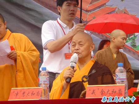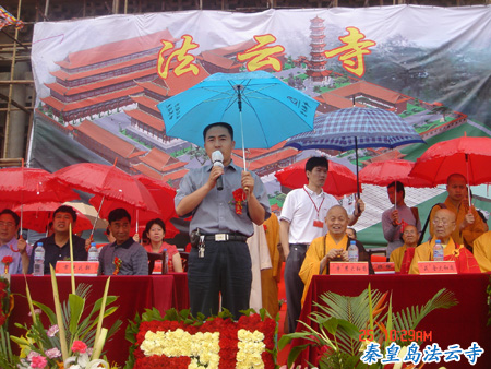 上梁仪式结束后,法云寺住持圣清法师代表法云寺僧团对各级领导、诸山长老对法云寺建设给予的关怀指导、广大护法居士的大力支持表示衷心的感谢,圣清法师介绍了法云寺建设规划和工程进度。净慧长老代表河北省佛教协会对法云寺大雄宝殿上梁法会表示祝贺,法云寺的兴建是河北佛教发展的大事,秦皇岛佛教虽然起步晚,但起点高,对市区各级领导对法云寺建设的协调和支持表示感谢,希望法云寺能早日建成,弘法利生。戒全长老及海港区副区长张浩、居士代表分别发表热情洋溢的讲话。秦皇岛市统战部苏裴华部长、徐维杰副部长,市民宗局李印林局长、白金梅副局长,海港区副区长张浩、海港区民宗局陈英华局长及相关领导出席庆典。