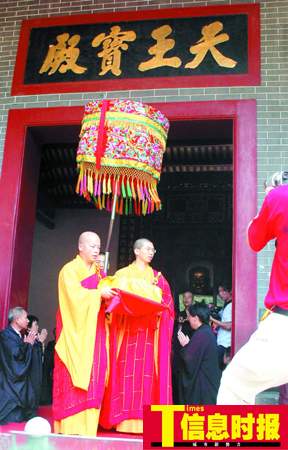 明贤(左)和慧在(右)两位法师护送经书出殿。杜翠 摄