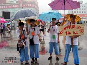 往石家庄火车站。清晨,暴雨突至,但义工们依然坚守岗位,迎接各地营员们的到来。