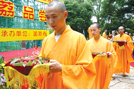 当日上午,在国恩寺古荔园一株六祖惠能1293年前亲手种植的佛荔树下,嘉宾游客们亲睹佛荔采摘的过程。随后,六位大师将采摘的佛荔供奉,最后将圣果分送给嘉宾游客品尝。一位来自广州的游客幸运地分得一颗佛荔,高兴不已。他觉得佛荔比普通荔枝小,味道虽然不太甜,但是很独特。