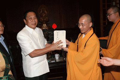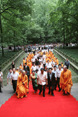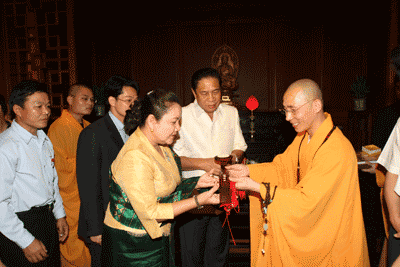 应国家主席胡锦涛的邀请,老挝国家主席朱马利一行32人,在北京相关领导及省领导的陪同下来我寺参访。