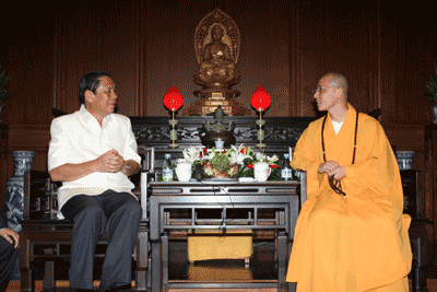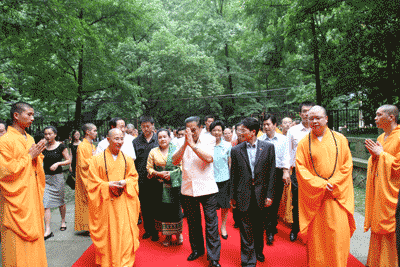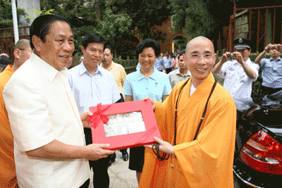 我寺监院觉乘法师,知客戒兴、戒清法师率领两序大众列队山门,夹道欢迎。朱马利主席一行在觉乘法师的带领下,依次参观了本寺的天王殿和大雄宝殿,觉乘法师详细的向朱主席介绍了我`寺的历史沿革及佛像塑造风格,深得主席的赞赏和认可。并在大殿门前,真诚邀请觉乘法师与其合影留念。其后,主席又虔诚的大殿内上香礼拜。参观完,宾主双方在联灯阁进行了座谈。座谈中,觉乘法师又向主席介绍了我寺发展的三个宗旨;一,继承佛教优良传统;二,弘扬佛教文化;三,会报社会。主席在听取了法师介绍后,向法师提出了;本寺僧人人数,我寺客流量,及入寺为僧的条件等问题。觉乘法师热情的都作了解答。主席还表示首次来访中国,对我国党和政对传统文化的保护表示钦佩。