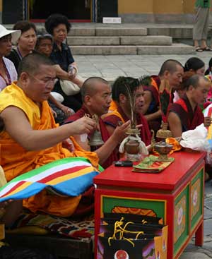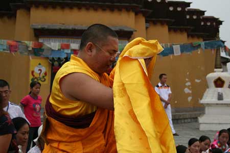 仪式由来自甘肃省甘南藏族自治州的科才活佛主持。上百名僧俗各界人士及游客参加了晒佛仪式。