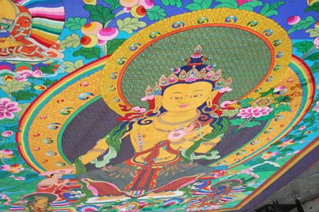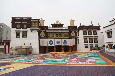 7月19日上午,一幅高29.33米,宽24.33米的巨型唐卡首次亮相北京中华民族园。此唐卡中心为黄度母(藏语称卓玛赛波),色彩明丽夺目。据悉,这幅唐卡是由藏传佛教的僧人手工制作的。