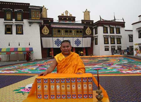 此次与唐卡同时展出的还有被称为“藏族大百科全书”的《雪域十明精粹大全》(国际开本10卷、32开本108卷,含1850万字)。这套由格西科才·慈智木花费15年时间编纂、整理出来的系列丛书,集纳了藏民族文化精髓,入选的作品全部由藏族学者用藏文撰写,为民族出版社重点藏文图书选题。