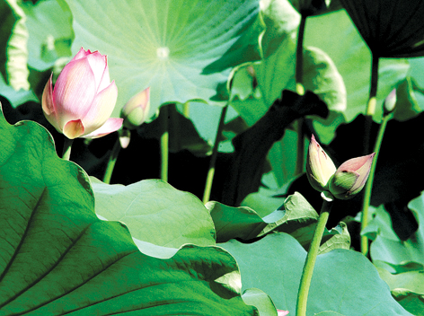 在满池茂盛的荷叶之中,如施了粉黛的少女的脸颊,显得楚楚动人