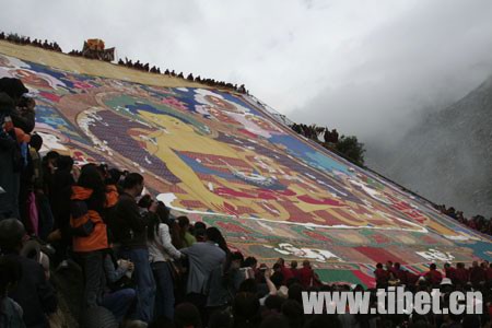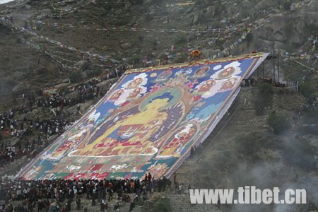 中国西藏信息中心报道:2006年8月23日,藏族传统节日拉萨“雪顿节”在西藏三大寺之一的哲蚌寺晒佛仪式中正式开幕。拉萨市各族各界代表3000多人当天上午在布达拉宫广场参加了隆重的开幕仪式。来自西藏各地的演员表演了精彩的藏戏和民族歌舞,整个布达拉宫广场沉浸在欢乐的海洋中。