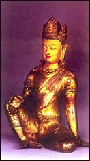自在观音菩萨,红铜鎏金,高32厘米,尼泊尔10世纪作品。观音左腿盘坐,右腿曲起,姿态闲适自如。头戴宝冠,顶立阿弥陀佛,袒胸斜披长帛,装饰简约,下着贴体长裙,没有凸起的衣褶,用刻线表现衣褶与花纹。形象庄严祥和,气韵沉雄,生动表现了观音菩萨大慈大悲的本性。