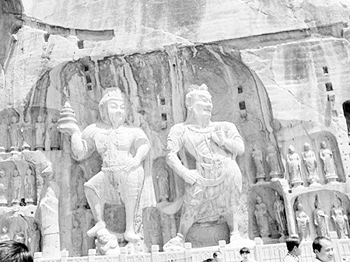 顺着石阶平台往前走十几米,我们来到了雕凿时间最长、用工最多的宾阳洞。这个窟前后用了24年才完成,洞内有11尊大佛像。主像释迦牟尼像,高鼻大眼、体态端祥,左右二边有弟子、菩萨侍立,佛和菩萨面相清瘦,目大颈平,衣锦纹理周密刻画,有明显西域艺术痕迹。窟顶雕有飞天,挺健飘逸,是北魏中期石雕艺术的杰作。洞中原有两幅大型浮雕《皇帝礼佛图》《太后礼佛图》,画面上分别以魏孝文帝和文明皇太后为中心,前簇后拥,组成礼佛行列,构图精美,雕刻细致,艺术价值很高,是一幅反映当时帝王生活的图画。