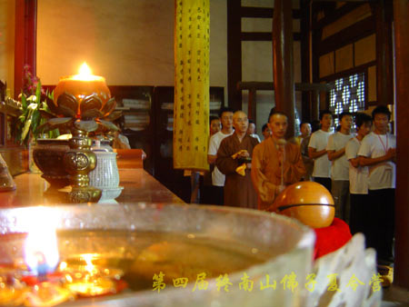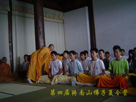 在净业寺的大雄宝殿,法师带领全体营员们共同念诵心经。