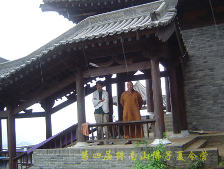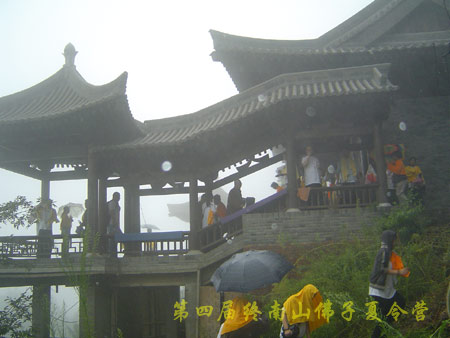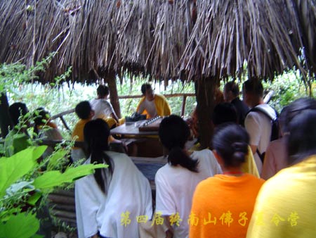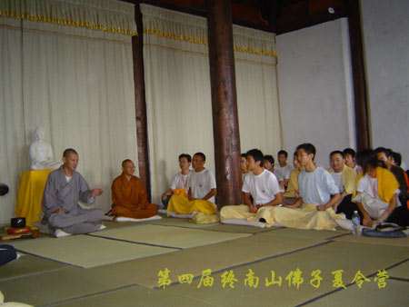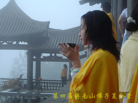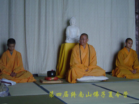 喝过热开水,大家进入禅堂。这里地势很高,屋外的白云不时飘进来。这座禅堂才修建好,因为这次夏令营要来这里,净业寺的法师们三天前就来打扫卫生,挂上窗帘。本如法师笑说,这就是坐看云起,常常“山中一片雾朦胧”。法师用生动幽默的话语给大家开示坐禅。