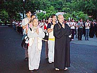 8月27日清晨千餘位信眾雲集不二門,朝山前聆聽淨業林堂主依嚴法師開示:朝山是從山下拜到山上,越拜越高,象徵著讓人生步步高昇;從山外拜到殿內,表示平時除注重心外,也注重心內,裡外兼修;從一人拜到萬人,表示越聚越多,越多越有,意味著須廣結善緣;從貢高拜到恭敬,越恭敬越有佛法,越有佛法越會有快樂,學佛令人處處法喜充滿。強調值本山創建40年,希望藉此朝山啟發菩提道種,開發內心般若智慧。