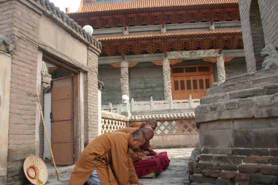 明贤法师、慧在法师在道安法师的陪同下,朝拜了译经大师鸠摩罗什祖师舌舍利塔,道安法师向两位高僧详细汇报了罗什寺的修建因缘、目前工程进度情况以及今后工程中存在的困难和问题,随行的摄制组拍摄了朝拜的全过程。接着,两位法师向各位居士结缘,希望各位居士在佛陀的护佑下消灾免难,增福增慧。道安法师也向两位法师及随行人员赠送了理智方丈所著的《三藏法师鸠摩罗什与武威罗什寺》一书和“鸠摩罗什祖师舌舍利塔”金箔画纪念品。