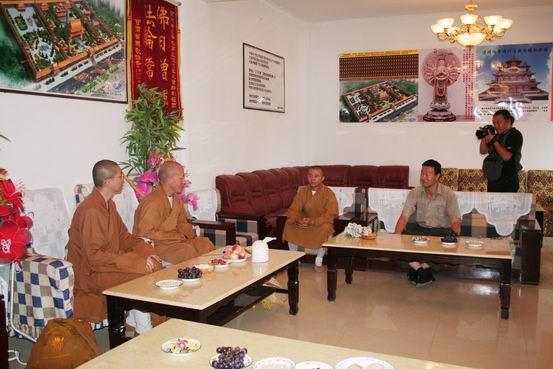 结善缘、共沾法益之后,道安法师邀请两位法师以及随行者到接待室座谈,区宗教局许虎林也参加了座谈。道安法师说:“两位法师沿着玄奘西行取经的路线,穿越葱岭、再涉流沙,为展示中华民族脊梁精神,难行能行、难忍能忍,是当今佛教界的一件盛事,令我们钦佩。”明贤法师说:“这次能重温先辈的取经精神,我也感到非常荣耀。”接着就罗什寺的有关土地落实、修建等问题进行了交谈,明贤法师讲道:“罗什祖师的舌舍利在这里,这是世界佛教界的一件盛事。罗什寺的发展是双向的,鸠摩罗什祖师是佛教界的译经泰斗,中国第一。我们作为鸠摩罗什祖师的子孙,一定要来鸠摩罗什寺朝拜。”区宗教局许虎林主任讲到:“凉州区佛教发展比较和顺,政府对佛教活动场所落实的也比较好,全区18处寺院,对佛教事业比较支持,尤其对罗什寺的支持是全力以赴,政府出钱搬迁了公、检、法、看守所、武警支队五个单位,至于对寺方的审批有几方面的制约因素,主要是修建进度慢,资金筹资力度不大。”听了区宗教局许主任的讲话后,明贤法师指出:“鸠摩罗什祖师道场的恢复建设,是我们共同的因缘,需要大家共同的参与,共同推动,这不仅是一个宗教活动场所,而且是佛教文化的载体,在历史上武威曾是四郡之都,佛教的文化底蕴不亚于敦煌。西夏文维摩诘经就出土在武威金刚亥母寺,在国际上是比较有名的。”明贤法师还提到了大云寺的开放,希望政府能把大云寺的钟文化价值挖掘出来,早日开放大云寺。