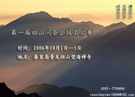 第一届祖山问茶会作为庐山禅茶会的发展,将与第六届庐山禅茶会同时分地进行。本届问茶会由秦皇岛市青龙县佛协与望海禅寺主办,于