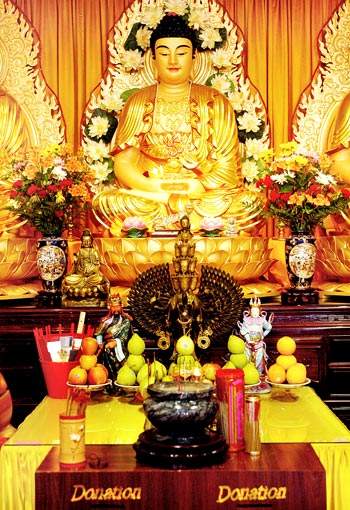 佛寿寺修持的是净土宗,殿内靠墙之处,三尊大于真人比例的金佛端坐在莲花宝座之上。一张供桌上供满了苹果、木瓜、橘子、东方梨,还有一尊大慈大悲的观世音像。殿内没有空调,只有排风扇在调节室内空气,几排桌子上蒙着藏红色织物,上面整齐地码放着佛经。在佛寿寺入口处的滑动玻璃门边,有个玻璃密封的佛龛,里面供奉着救拔病苦的药师佛。