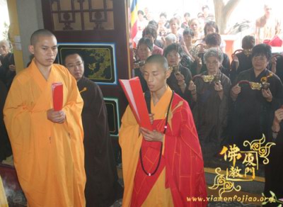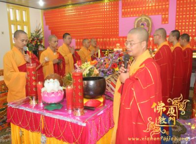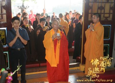 9月25日上午7:30分四众弟子云集大雄宝殿,礼请南普陀寺首座了法法师主法,高唱杨枝净水赞、大悲咒、心经、清净道场,做好拜忏前的准备。经云:礼拜万佛名字现世可以消业、增福,未来可以常遇诸佛,得成佛道。值此难得殊胜法会,四众弟子都无不虔诚的顶礼诸佛,利益自他。