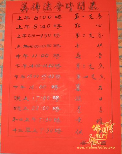 据厦门佛教在线报道:适值中国传统节日——中秋来临之际,厦门虎溪岩寺于2006年9月25日至10月4日(农历八月初四至八月十三日)启建万佛大斋盛会道场。并于10月4日上午7时30分供天,晚17时施放瑜伽焰口,以此祈祷世界和平、国泰民安。