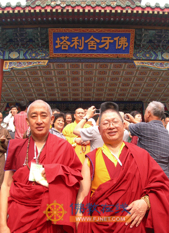 2006年9月19日上午9:00,五省区藏传佛教会长研讨班全体学员参拜灵光寺佛牙舍利。中国佛教协会副会长兼秘书长学诚法师与中国佛教协会常务理事、灵光寺监院常藏法师率四众弟子列队迎接,并举行了隆重的欢迎仪式。学诚法师代表中国佛教协会向研讨班全体学员表示亲切问候。中国佛教协会副会长、中国佛教协会西藏分会珠康.土登克珠仁波切对学诚法师和灵光寺四众弟子的热情欢迎表示衷心感谢!随后,以珠康.土登克珠仁波切为首的藏传佛教高僧大德在佛牙舍利塔前举行了诵经祈祷仪式,并向佛牙舍利敬献了哈达。