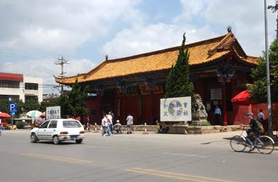 圆通寺始建于唐朝南诏时代,因年代久远,建筑汇集了3个朝代的风格,在布局上非常特异。与其他佛寺不同的是,圆通寺进山门后不是上坡,而是要沿着中轴线一直下坡,大雄宝殿地处寺院的最低点。佛寺坐北朝南,富丽堂皇,整个寺院以圆通宝殿为中心,前有一池,两侧设回廊绕池接通对厅,形成水榭式神殿和池塘院落的独特风格。此风格在我国寺庙建筑中,可谓突破陈规,别具一格。