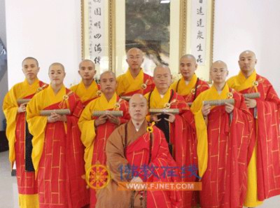 传法大典礼请觉光长老(中),圆山长老(左),戒忍大和尚(右)为尊证,为众法子证盟得法