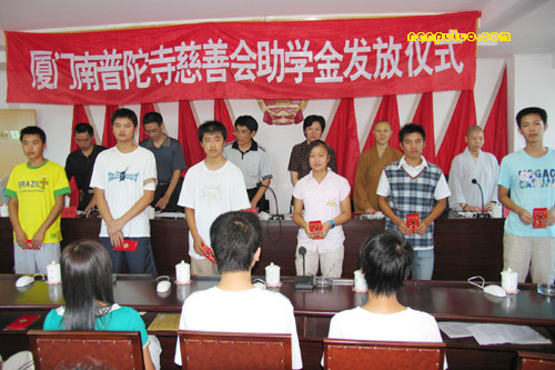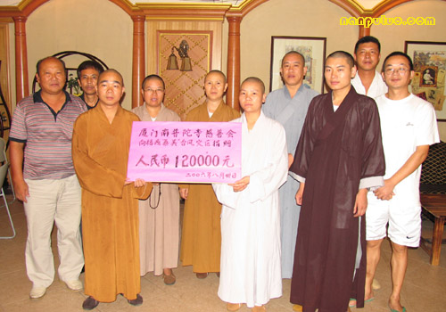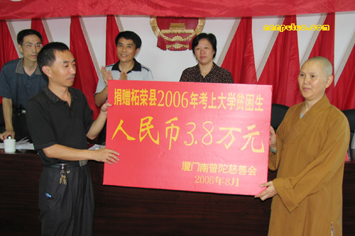 8月30日,遵照南普陀寺慈善会会长圣辉大和尚的指示,慈善处德鸣法师、天真法师和觉明法师一行,来到闽东开展助学和赈灾活动,向福鼎灾区捐赠12万元赈灾款;资助柘荣县特困大学新生3.8万元助学金。