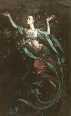 后来,乾闼婆和紧那罗相混合,男女不分,职能不分,合为一体,变为飞天。现在,把早期在天宫奏乐的叫“天宫伎乐”,把后来持乐器歌舞的称“飞天伎乐”。