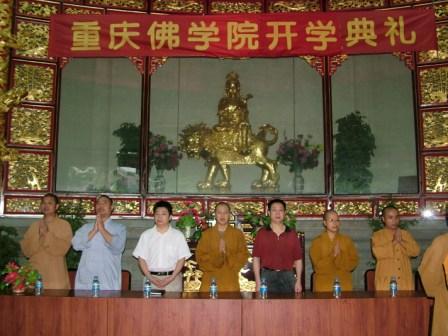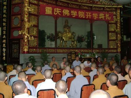 重庆佛教在线消息 9月5日上午,重庆华岩寺隆重举行重庆佛学院新学期开学典礼。典礼由佛学院教务长寂让法师主持,参加典礼的有佛学院常务副院长道坚法师,佛学院副院长正刚法师,朗光法师,常慧法师,市委统战部李有福先生,市民宗委褚新副处长,张勇调研员及佛学院所有师生。典礼上,佛学院常务副院长道坚法师做了重要讲话。