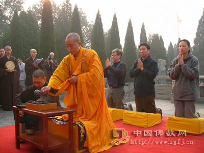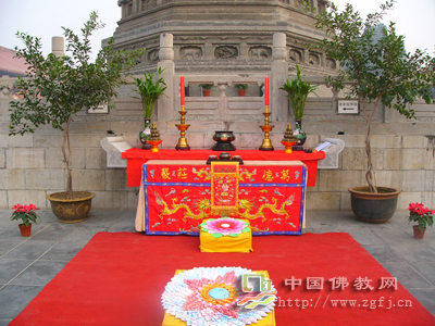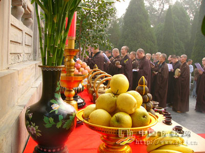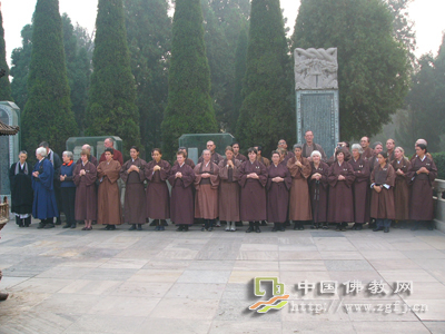 据中国佛教网报道:10月18日上午8时,柏林禅寺僧众与美国禅宗参访团在祖师舍利塔前举行“赵州禅茶”茶供仪式,禅宗参访团团员身着庄严的僧装,整齐化一,共沾法喜。