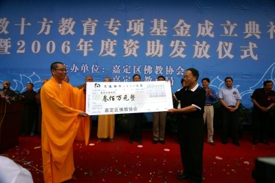 上海嘉定区佛教协会捐助300万元,设立“佛教十方教育专项基金”。从今年开始,分10年为全区九所公办高中学校的二百名家庭困难的在校高中生提供困难资助。佛教界为教育系统提供专项资助,在上海地区尚属首次。