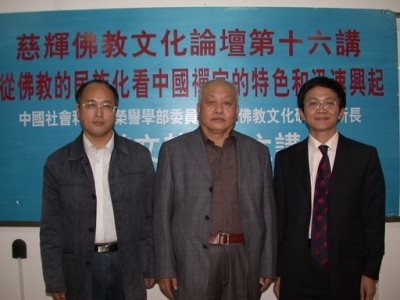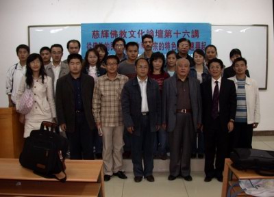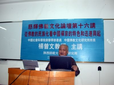据佛学研究网报道:2006年10月19日,“慈辉佛教文化论坛”第十六讲在陕西师范大学长安校区文津楼201教室隆重举办。本次论坛由中国社会科学院荣誉学部委员、中国佛教文化研究所所长杨曾文教授,作“从佛教的民族化看中国禅宗的特色和迅速兴起”演讲。《中国禅学》主编、佛学研究网主编、陕西师范大学佛教研究所所长、博士研究生导师吴言生教授主持了讲座。宗教中心宗教学理论研究所所长吕建福教授,以及社会人士、陕西师范大学的同学共三百余人参加了讲座。