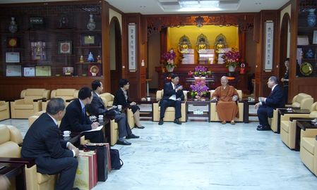 佛教在讯15日台湾讯 日前,中华宗教文化交流协会会长叶小文等一行四人受到台湾佛光山星云长老的邀请访台,参加国际佛光会会员代表大会开幕礼后,五日即展开一连串的拜会行程,首站即到台北市首刹善导寺拜会中国佛教会名誉理事长、世界佛教僧伽会会长了中长老,双方相见甚欢,在短暂谈话中已表达了彼此的诚敬与仰怀之意。