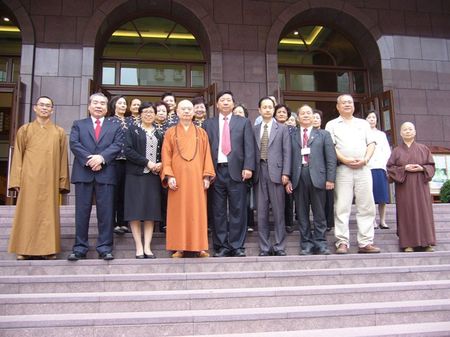 是日,善导寺了中长老及护法居士于山门迎接叶小文会长等一行四人的莅临,了中长老引叶会长等一行四人前往观照堂进行茶叙。叶会长首先向了中长老会报此行程因系临时决定,虽然星云长老一直要叶会长相陪,但叶会长也坚持既然来到台湾,一定要来拜会长老。所以处理完佛光山的事后,第一件事就是来拜访了中长老。尤其一再表示欲前来拜会长老时,即蒙长老慈悲首肯,除感谢了中长老出席世界佛教论坛外,并表示善导寺处于台北的心脏位置,两年前的大殿落成暨圣像开光无法前来,是由杨同祥等前来祝贺,倾闻此地的“大雄宝殿”四字乃中国佛教协会前会长赵朴初老居士题赠,今日能够如愿亲自瞻仰题名,备感亲切。