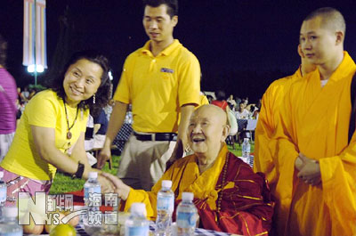 当晚八时许,在三亚南山文化旅游区,前来参加“南山邀明月 南海拜观音”中秋晚会的人们,纷纷争先恐后地与一位慈眉善目的高僧合影留念。随后,在一片梵唱声中,南山寺法师列队迎接高僧从红地毯走上了舞台,迎经礼佛仪式正式开始。