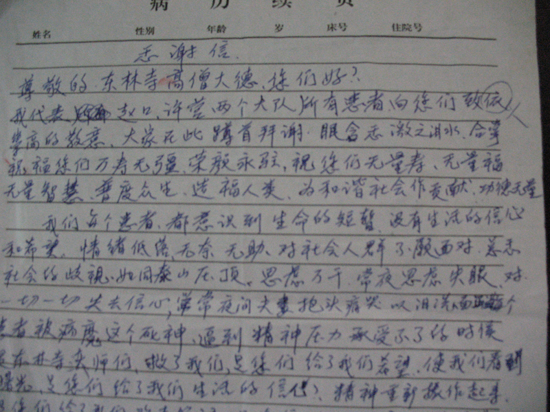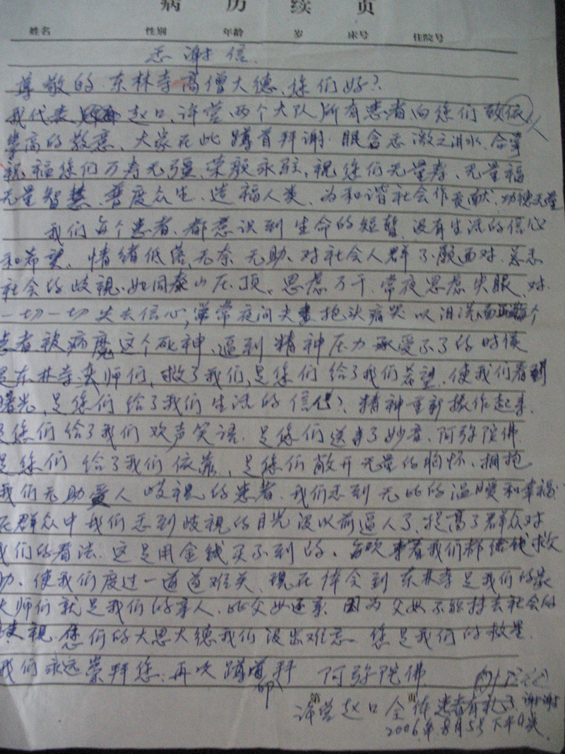 我们每个患者都意识到生命的短暂,没有生活的信心和希望,情绪低落,无奈无助,对社会人群不愿面对,总感社会的歧视,如同泰山压顶,思虑万千,常夜思虑失眠,对一切一切失去信心,常常夜间夫妻抱头痛苦,以泪洗面,正当每个患者被病魔这个死神,带到精神压力承受不了的时候,是东林寺法师们救了我们,是你们给了我们希望,使我们看到曙光,是你们给了我们生活的信心,精神重新操作起来,是你们给了我们欢声笑语,是你们送来了妙音阿弥陀佛,是你们给了我们依靠,是你们敞开无量的胸怀,拥抱我们无助受人歧视的患者,我们感到无比的温暖和幸福,在群众中我们感到歧视的目光没以前逼人了,提高了群众对我们的看法,这是用金钱买不到的。你们每次来看我们都给钱救助,使我们度过一道道难关,现在体会到东林寺是我们的家,法师们就是我们的亲人,比父母还亲,因为父母不能抹去社会对我们的歧视。您们的大恩大德我们没齿难忘,您是我们的救星,我们永远崇拜您们。再次蹲首叩拜,阿弥陀佛。